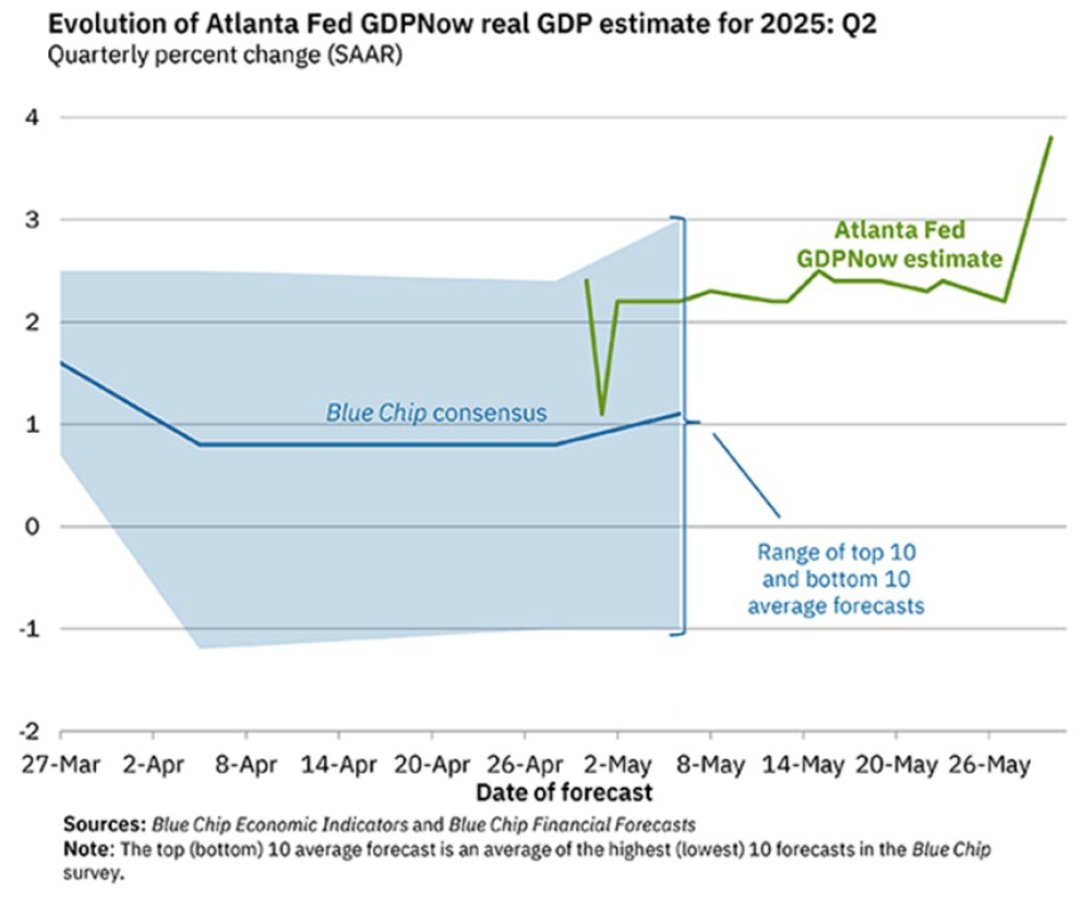 Fun With Fundamentals. It has been a tumultuous year so far for the U.S. stock market, but the outlook is improving as we head toward the middle of the year. The much anticipated economic recession in 2025 is shaping up to be just as elusive as it was in 2022, 2023, and 2024. One look at the latest readings for 2025 Q2 GDP according to the Atlanta Fed GDPNow forecast shows an economy that if anything is picking up steam (see that green line spike on the right below – that’s approaching +4%), not losing it.