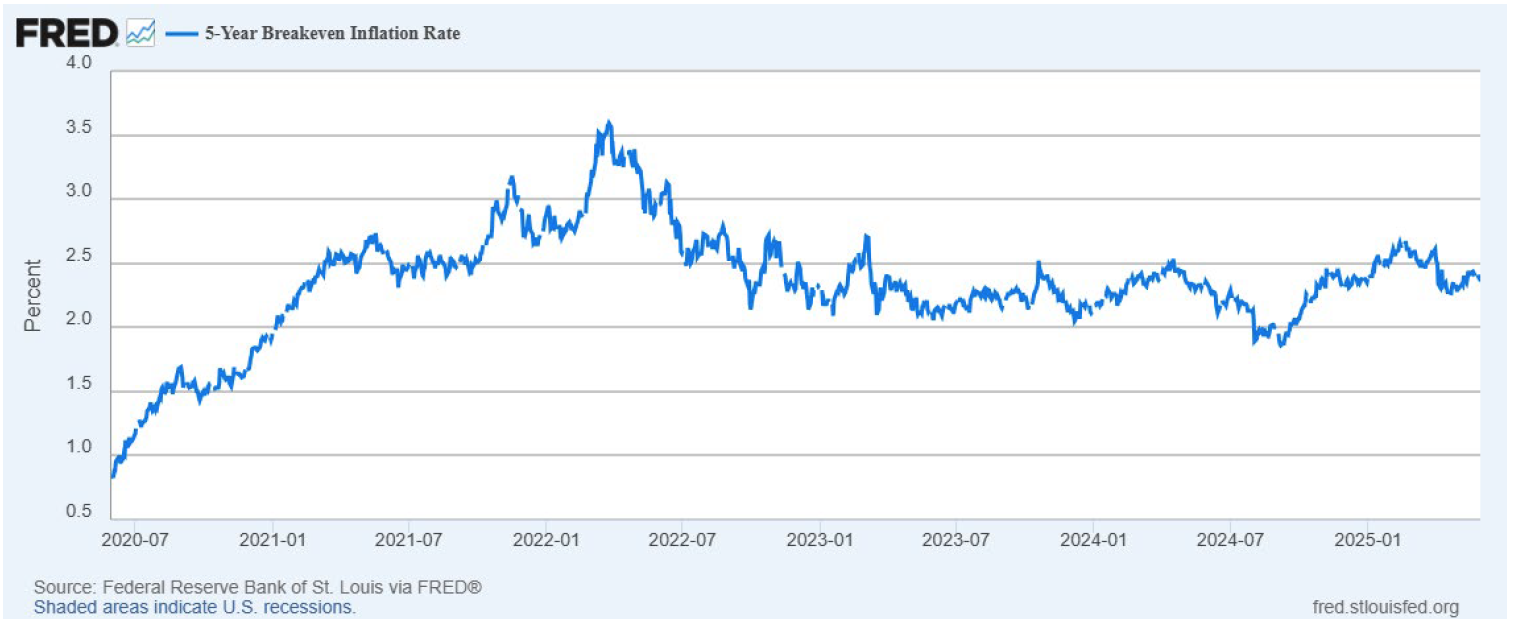 Then there is all of the understandable handwringing about the threat of inflation, particularly given the ongoing uncertainty associated with the pending tariffs being imposed on our global trading partners. But as I enjoy my ranch water and TACOs this summer (cheeky), I’m continually reminded that inflation expectations as measured by the 5-Year Breakeven Inflation Rate (average expected inflation over the next five years as priced by the market) remains subdued at well under 2.5%. Stay thirsty and ponder more dip buying this summer (maybe don’t hold the guac after all), my friends.