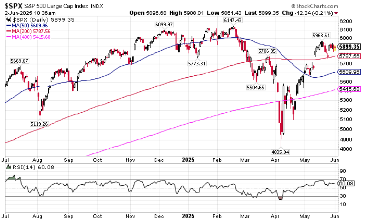 Widespread technical support for the headline benchmark S&P 500 also remains encouraging. Following the market correction that took place from February 19 to April 7, moving average lines have reconverged (in other words, excessive froth has been wrung out of the market) and multiple key support lines have now been retested and reestablished. Case in point – consider the recent three day cut lower in stocks at the end of the week before last amid the latest tariff chatter. Although the “markets crashing” narrative suddenly found its way back into the financial headlines for a hot minute until last Monday came again, we see in the chart below a stock market that is very well behaved from a technical perspective. Basically, the S&P 500 hit a short-term peak at 5968.61, fell back for three days into its 200-day moving average at around 5767 at the time (red line below), found support, and subsequently bounced higher. This is what a technically predictable and well behaved market looks like.